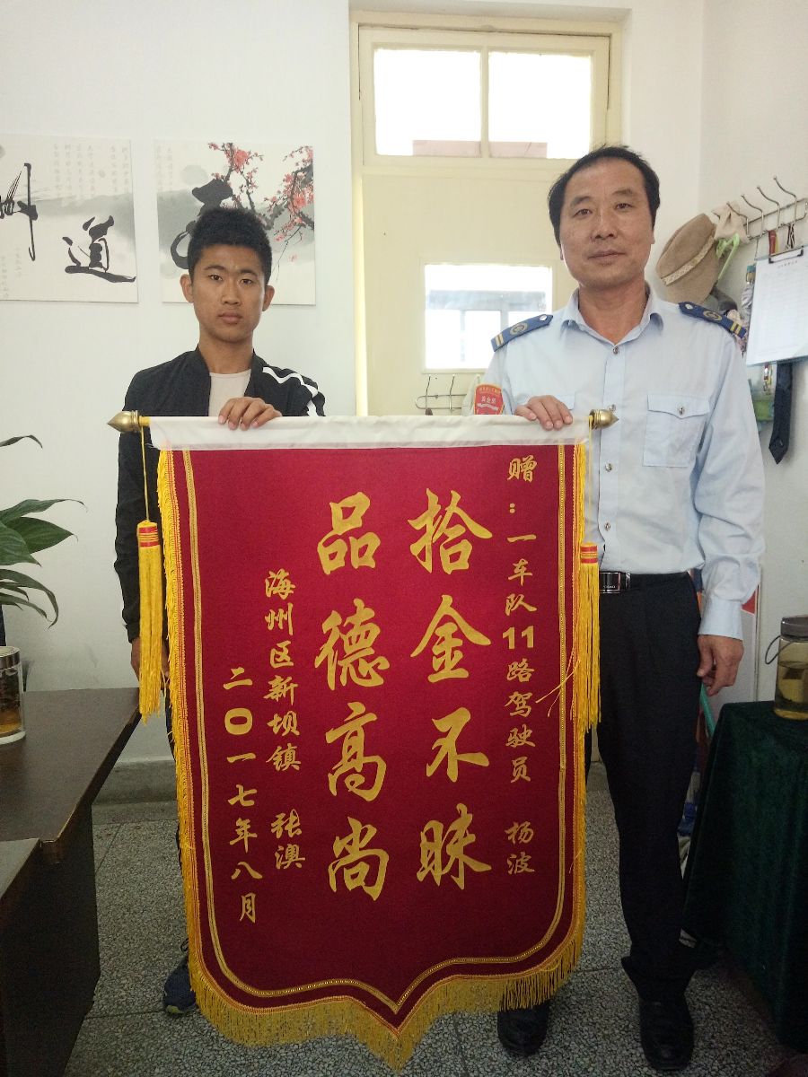 据张同学讲,下午他带着4500元的学费从新坝坐公交车到学校报到,发现自己把报到时间给弄错了,本该30日报到的,他记成了29日,便又坐公交车返回家。由于心里一直惦记着开学时间的问题,下车时竟把背包落在了座位上。下车后发现背包丢了,他惊出了一身冷汗,赶忙乘坐下一班11路赶到了新海路停车场。在公交驾驶员杨波、车队长王强、调度员徐萍的帮助,替他找回了背包。看着失而复得的背包,这个半大的男孩掩饰不住内心的喜悦和激动,用羞涩而又兴奋的声音重复着说:“我要给你们送锦旗,谢谢阿姨叔叔帮我找回了包和学费。”