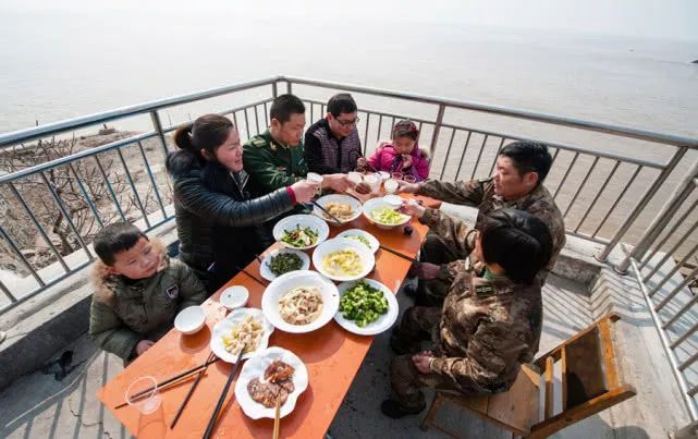 王志国(左三)和姐姐一家在开山岛上和父母团聚(2015年2月13日摄)。边防干警王志国是王继才夫妇的儿子,由于要在连云港灌南边防大队值哨,无法在除夕夜和家人团聚,因此,他提前来到开山岛,陪父母巡岛,和家人提前团聚