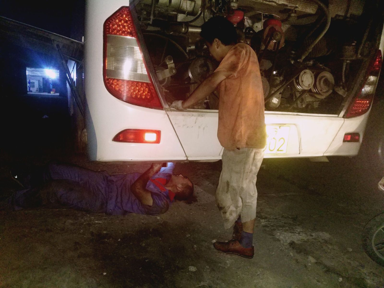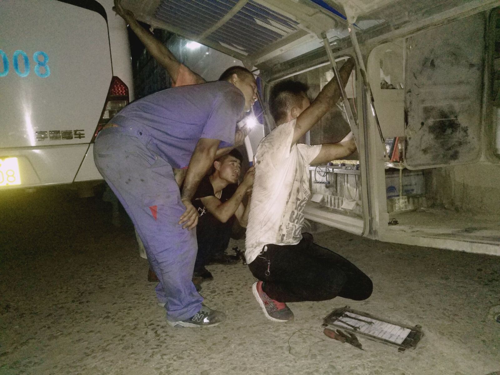 接到修理单,车间主任包海涛带着几名修理工立即出发赶往现场。到了现场,修理工王守状爬入车底、检查车况、回厂修理。完成一次抢修任务回来,汗水已经浸透了他的衣服。为了应对运营中突发的车辆故障,车间随时都有修理人员待命,第一时间赶往现场抢修。每一次的抢修都是露天作业,少则十几分钟,多达半个小时,往往出一趟抢修,回来就像蒸了一个桑拿浴,而这样的待遇,他们一天就要“享受”3—4次。王守状说:“最辛苦的就是大中午去抢修,没有防暑工具,带上硬板纸,垫在下面就要开始抢修。”