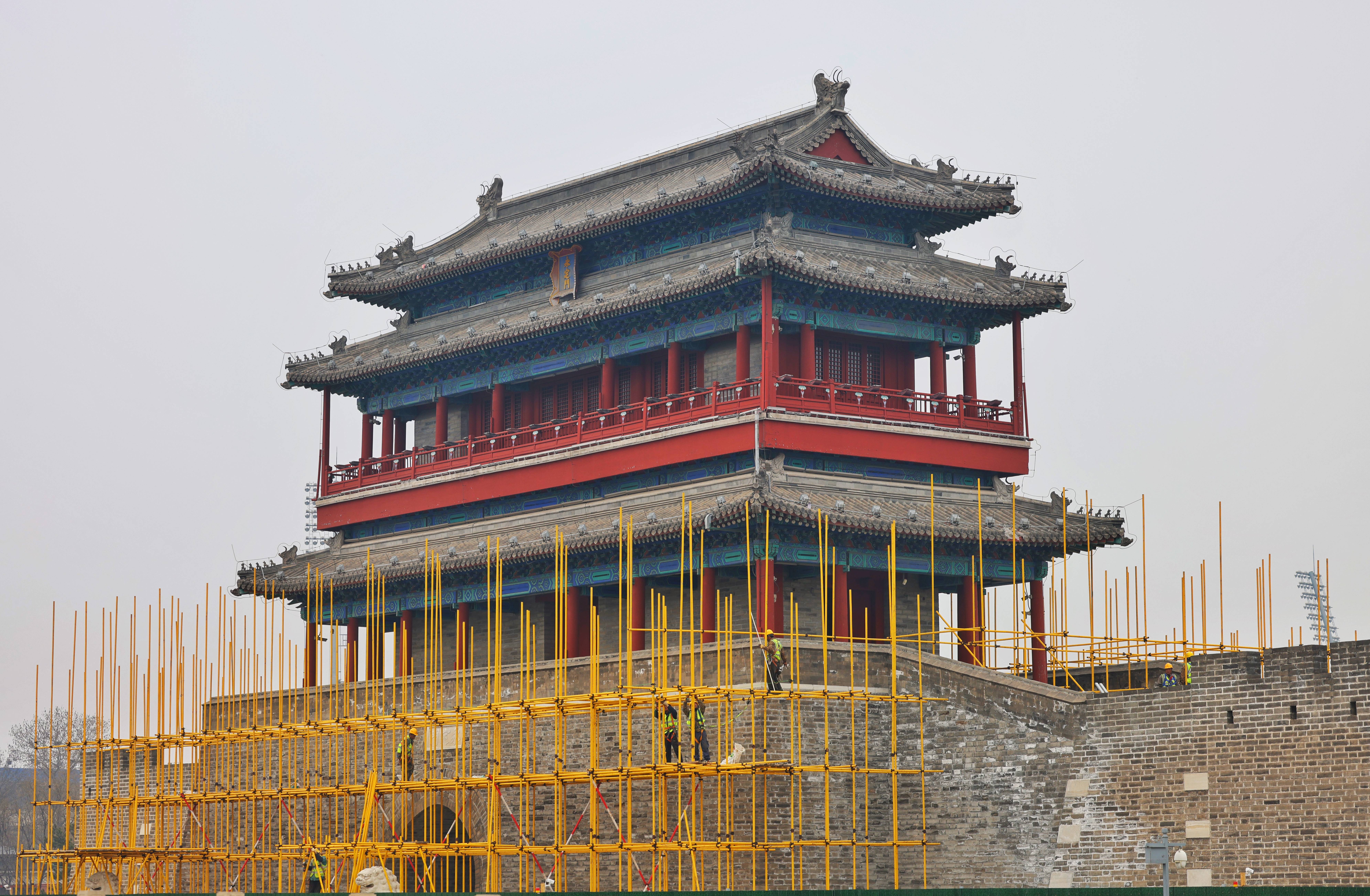 永定门城(cheng)楼已搭设黄色脚手架,正式进入主体修(xiu)缮施工阶段。新京报记者(zhe) 王(wang)贵彬(bin) 摄