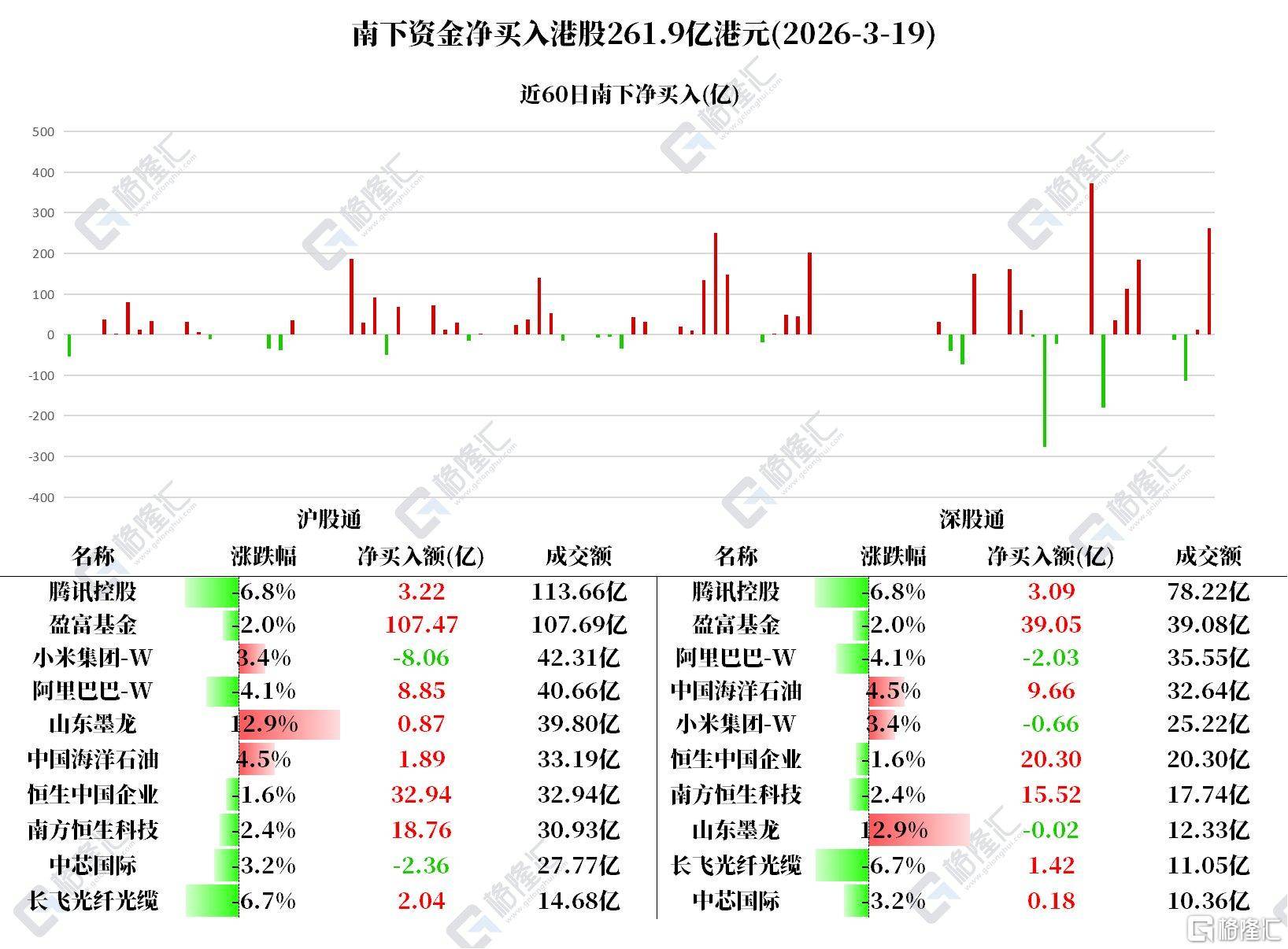 3月19日,南下资金净买(mai)入港元261.9亿港元。